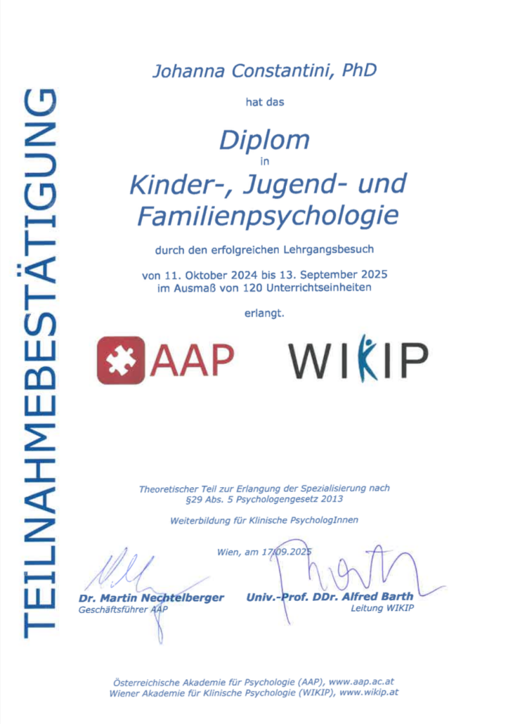 Ich freue mich, den vertiefenden Lehrgang für Kinder-, Jugend- und Familienpsychologie im September erfolgreich abgeschlossen zu haben. Danke an das Team der Österreichischen Akademie für Psychologie sowie der Wiener Akademie für Klinische Psychologie für die tolle Organisation. Ich freue mich, für die Ausbildungseinrichtungen bald selbst wieder einige Fortbildungen – vor allem rund um das Thema online Medien und Kommunikation – verantworten zu dürfen.